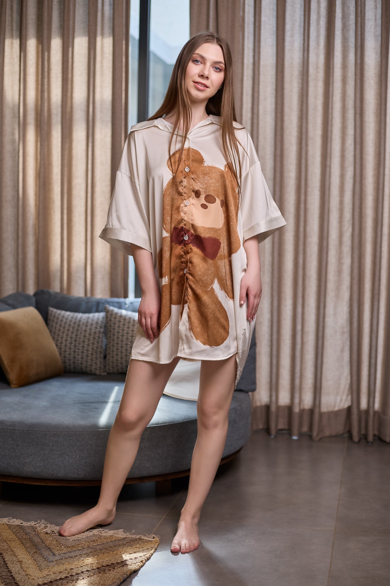 Wrap yourself in whimsical comfort with our Teddy Charm Satin Nightshirt. Crafted from luxurious satin, this oversized button-down shirt features an adorable teddy bear print with bowtie detailing—bringing the perfect balance of cozy and cute to your wardrobe.