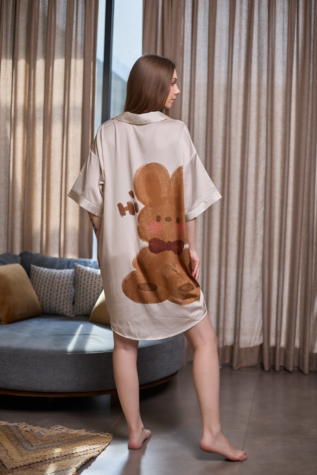 With a relaxed silhouette and breathable fabric, this piece is ideal for lounging, sleepovers, or laid-back weekends. The neutral beige tone flatters all skin types, while the playful bear adds a lighthearted twist to your nighttime style.