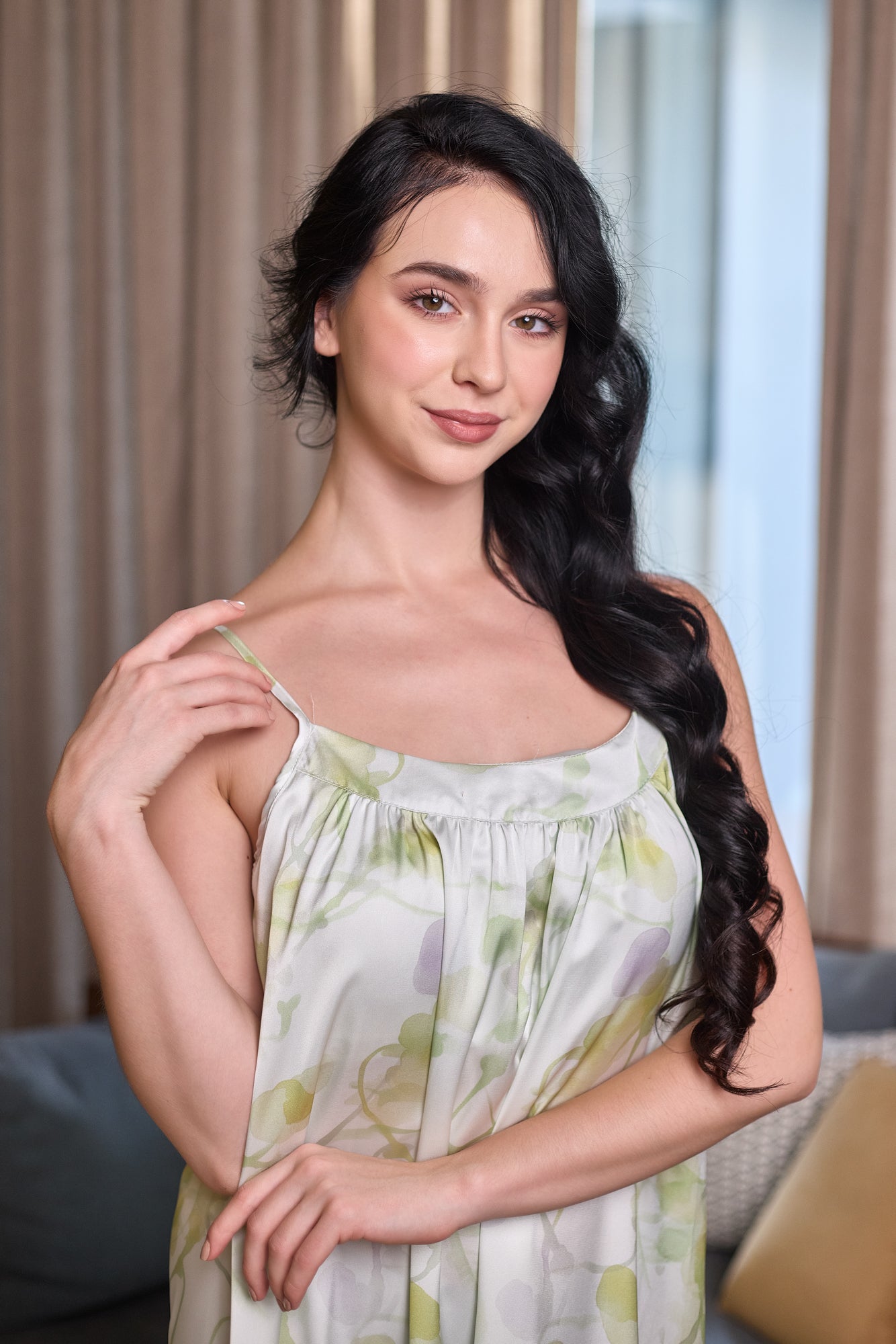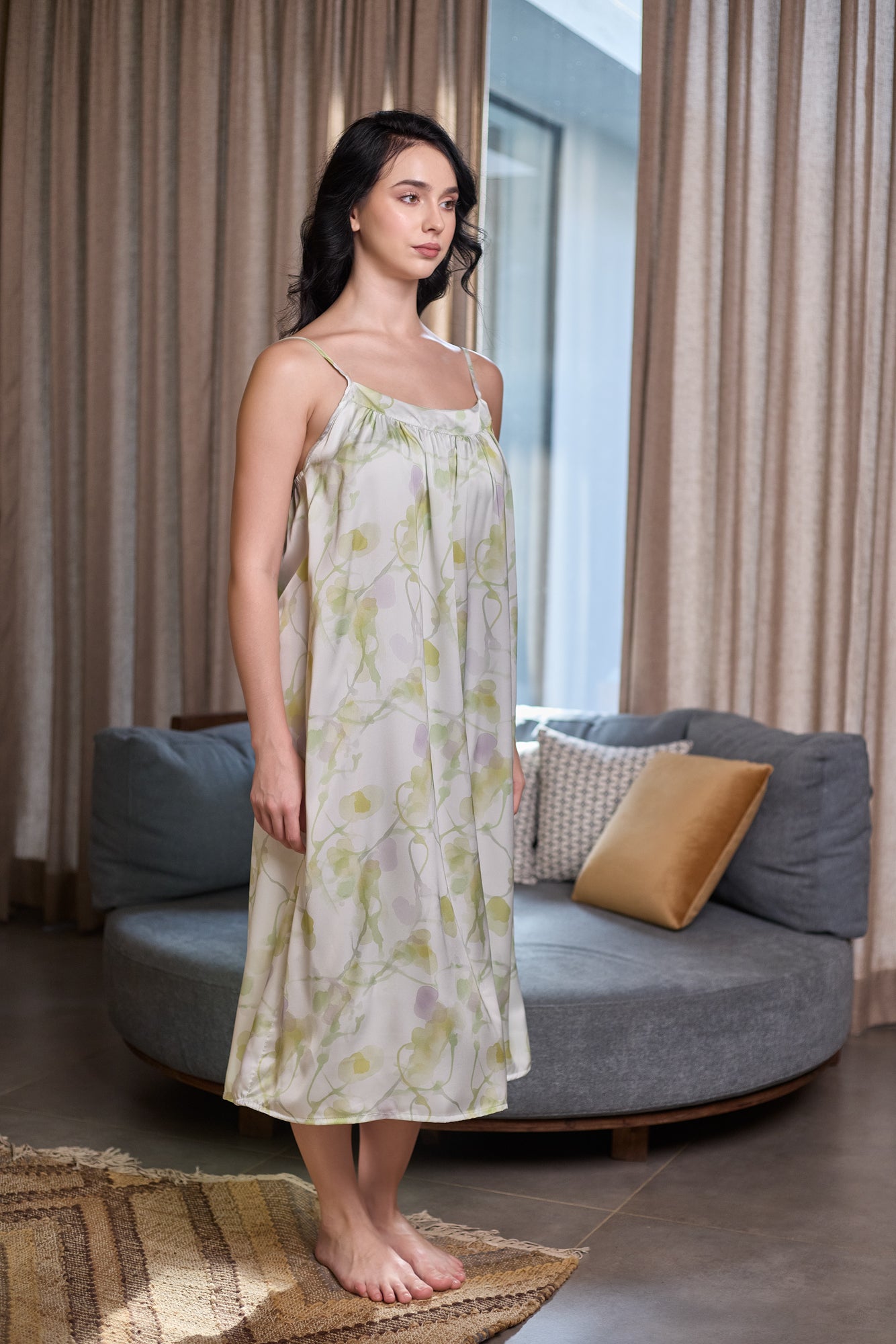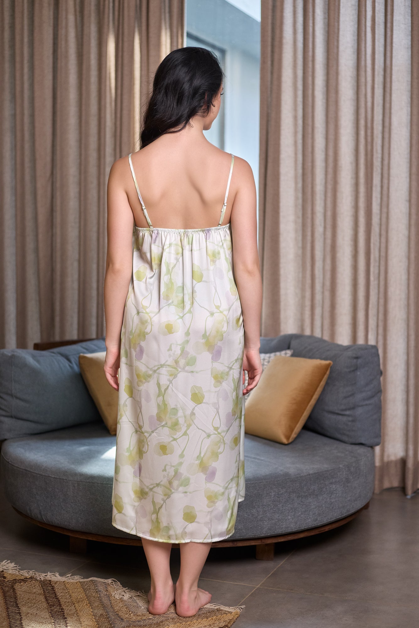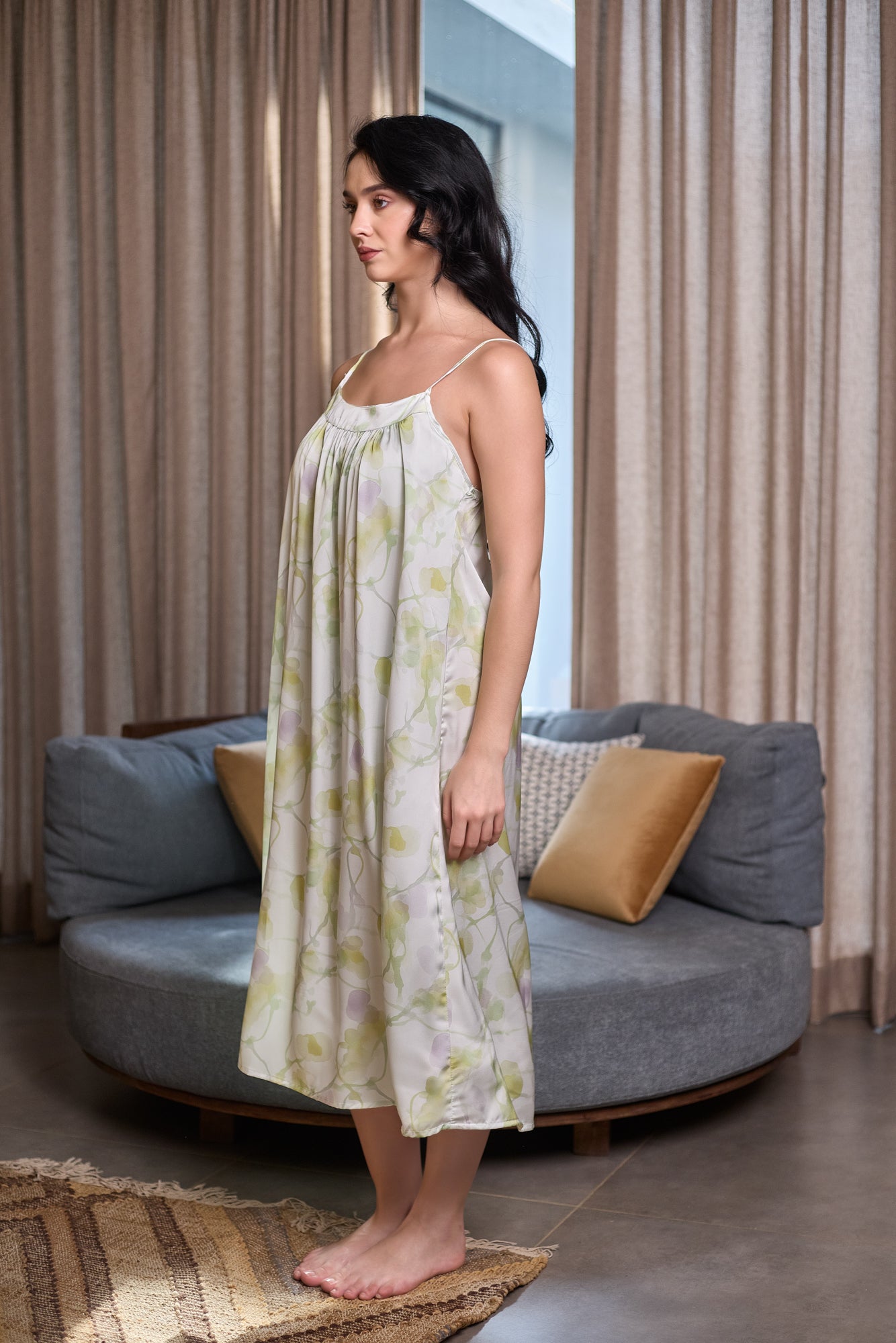 Embrace the art of slow evenings in our Floral Mist Satin Nightdress. Crafted in a lightweight satin blend, this flowy piece features an enchanting green and lilac abstract floral print that soothes the senses. The soft gathers along the neckline create an elegant drape that flatters all body types, while the adjustable thin shoulder straps provide a customized fit.