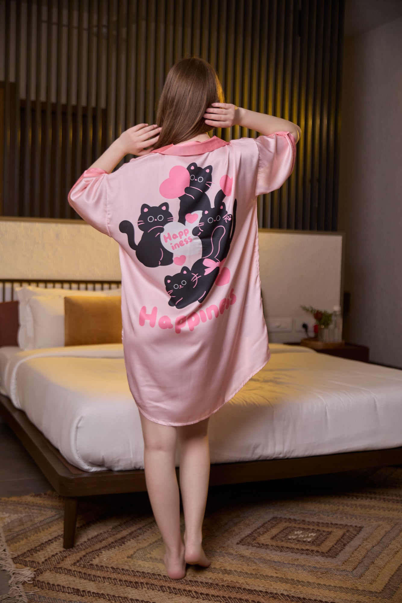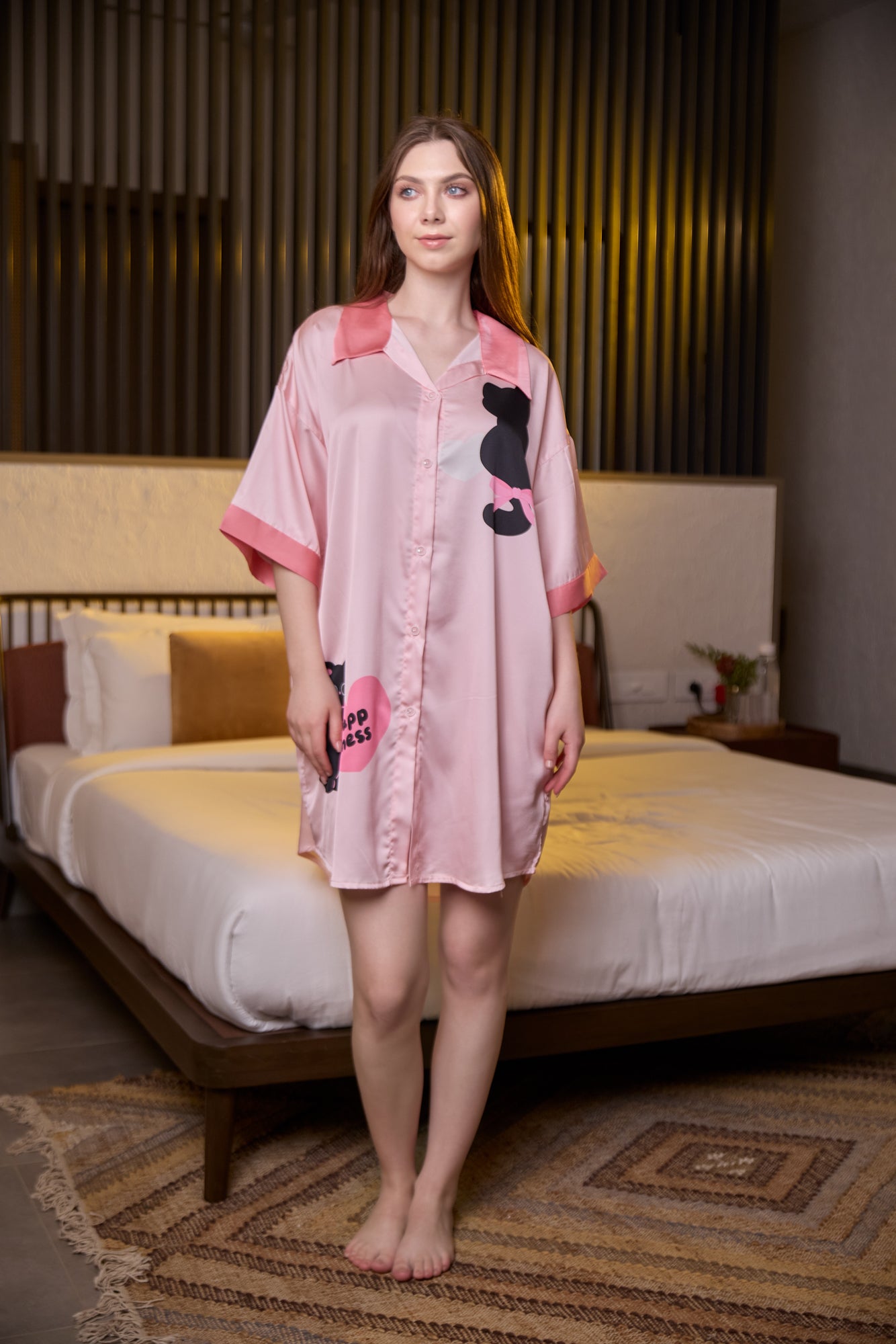 Bring cuteness to bedtime with our Playful Pink Cat Print Satin Nightshirt. Crafted from ultra-soft satin, this shirt-style sleepwear is designed in a relaxed fit with a button-down front and short sleeves. Adorned with delightful cartoon cat prints and “Happiness” heart motifs, it’s the perfect mix of comfort and charm.