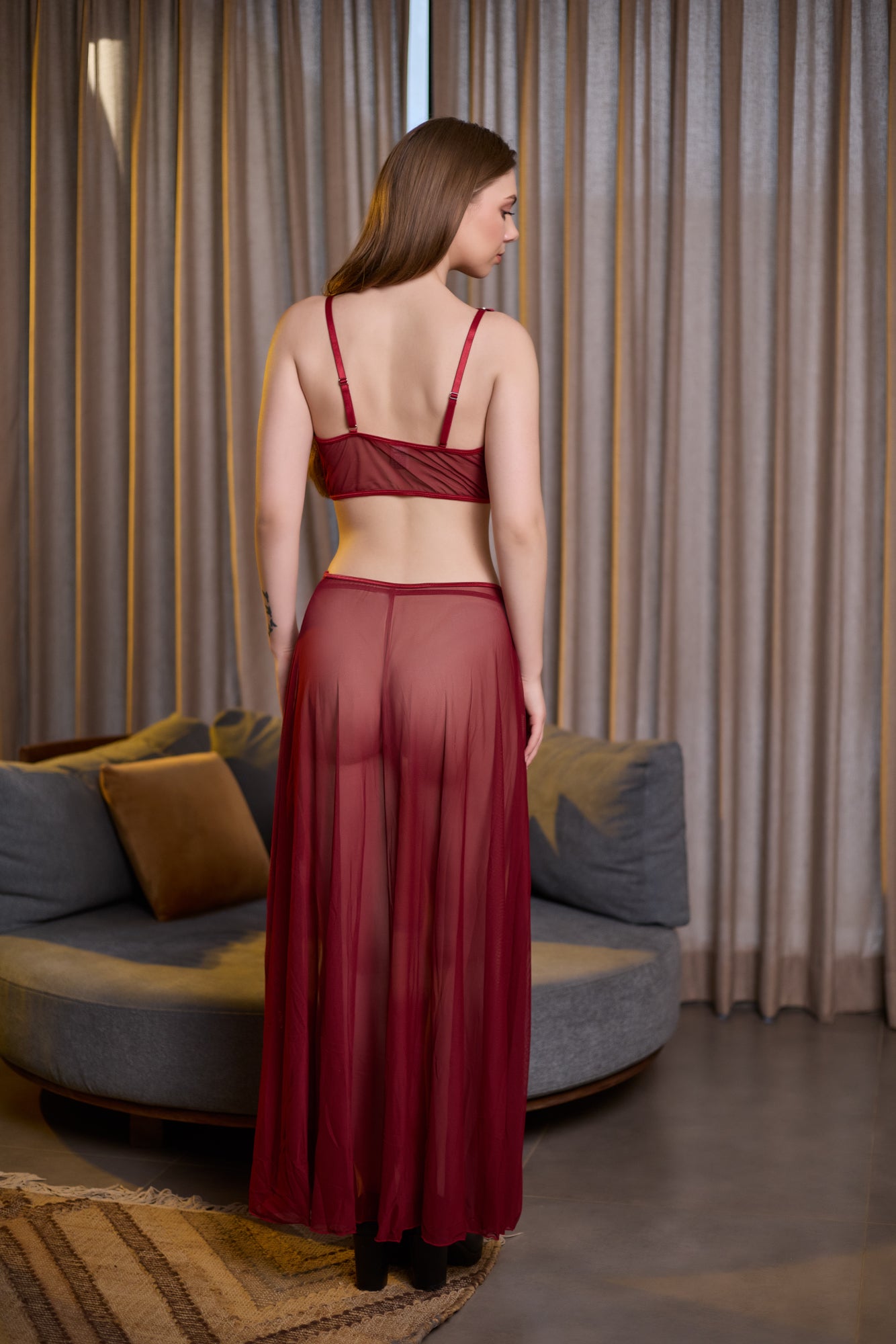 Wine Red Mesh Bra & Skirt Lingerie Set with Pearl Chain
